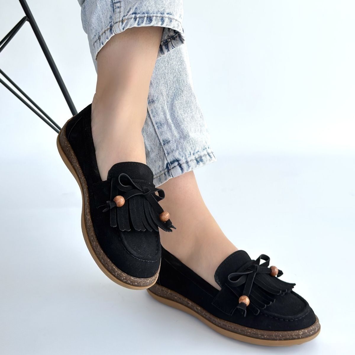 Boriy Siyah Deri Tozu Süet Babet Ayakkabı