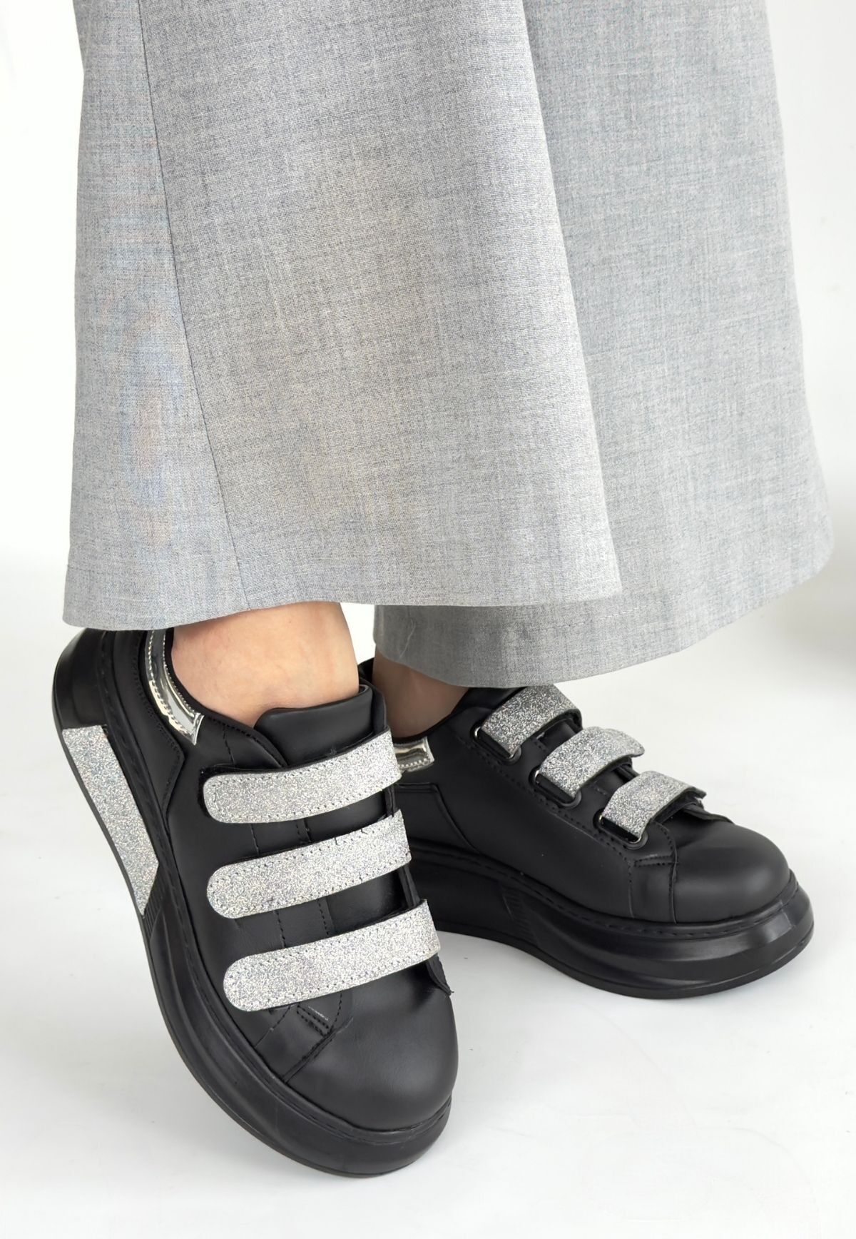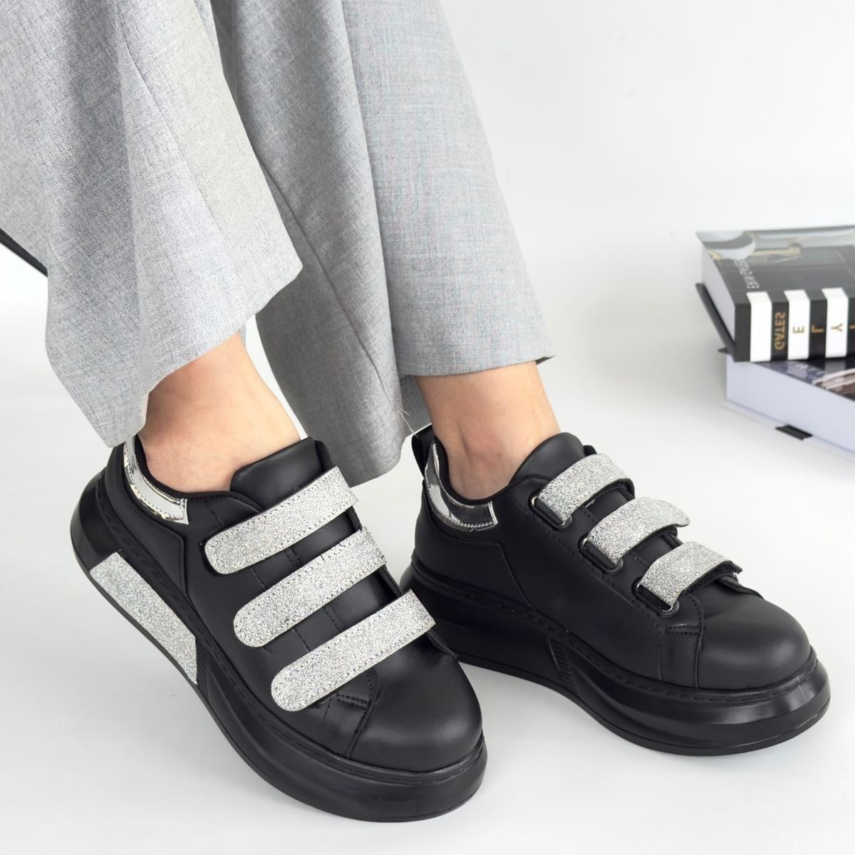 Elika Siyah Cilt Simli Cırt Cırtlı Spor Ayakkabı