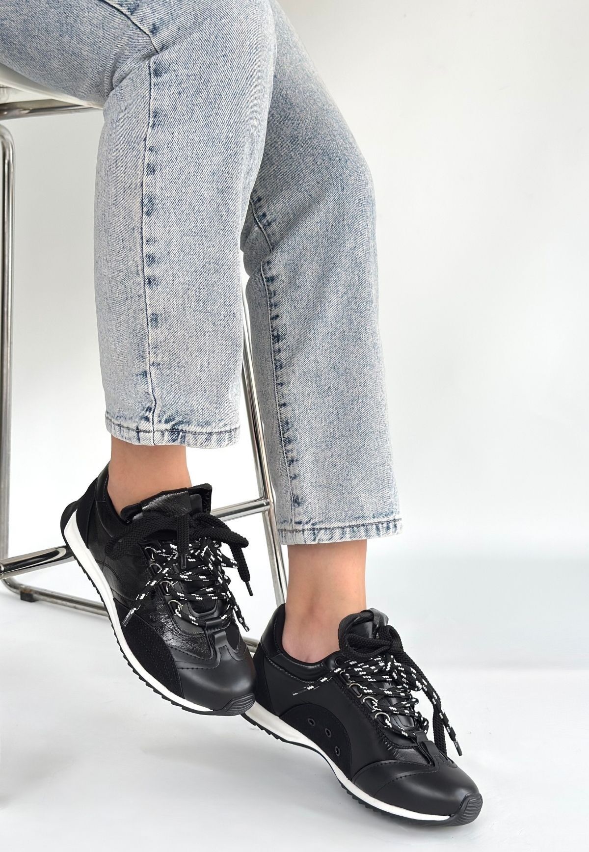 Reat Siyah Cilt Bağcıklı Paraşüt Detaylı Spor Ayakkabı